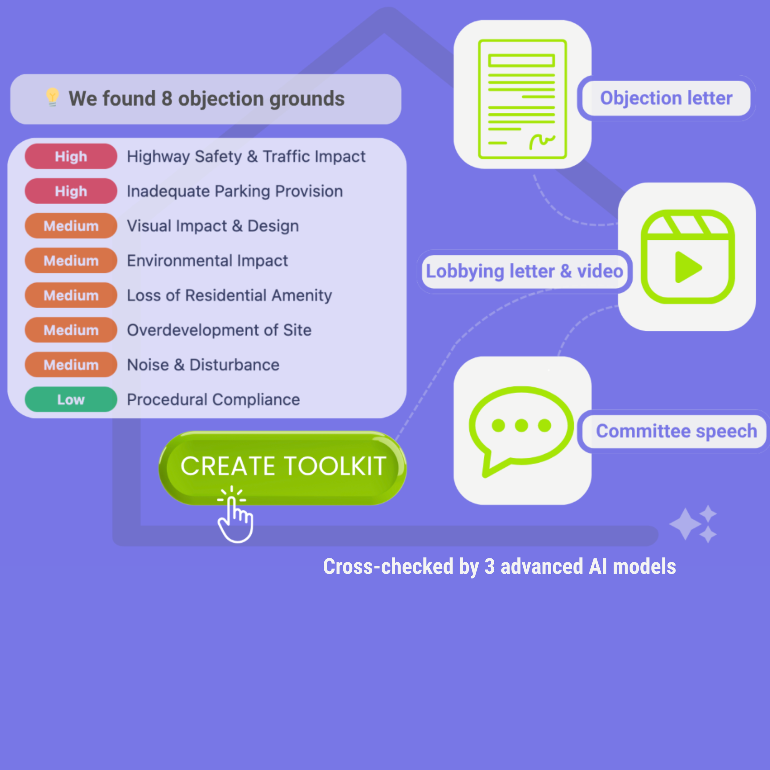 Pay just £349 to generate your complete planning objection toolkit, including an objection letter, lobbying letter/video, & planning committee speech - all complete with planning policy references.